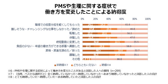 6.PMSや生理に関する症状で働き方を変更したことによる納得度では、時短勤務に変更した / 昇進昇格を諦めた・断った 女性のうち4割超が「納得できなかった」ことが判明