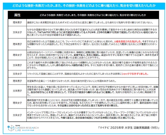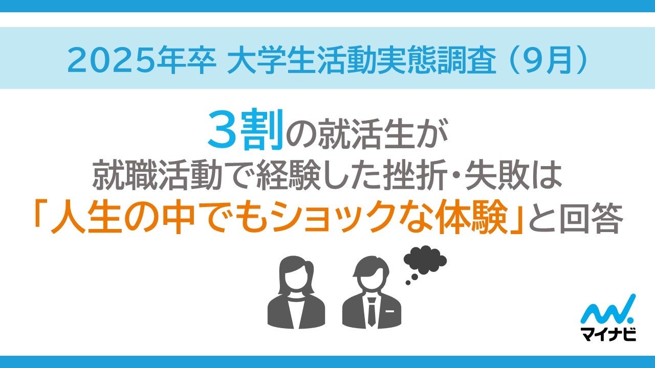 9月の内々定率は89.8%で前年比3.3pt増。3割の就活生が就職活動の挫折経験は「人生の中でもショックな体験」と回答。一方で「成長の機会」「気持ちを切り替えて再挑戦した」など前向きな声も