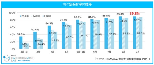 ◆2025年卒業予定の大学生・大学院生の内々定率は89.8%(前年比3.3pt増)内々定を持つ学生は内定式を見据え、就職活動終了は10月を予定