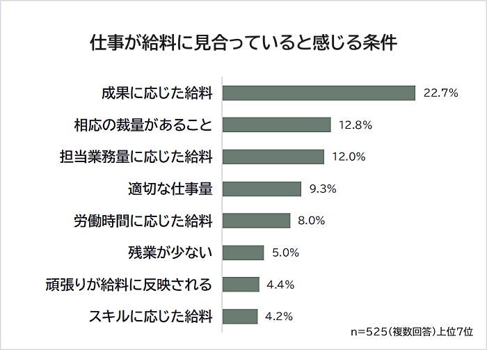 「仕事が給料に見合っていると感じる条件」を聞いたところ、1位は「成果に応じた給料(22.7%)」でした。2位「相応の裁量があること(12.8%)」、3位「担当業務量に応じた給料(12.0%)」が続きます。