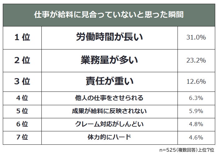 社会人525人に「仕事が給料に見合っていないと思った瞬間」を聞いたところ、1位は「労働時間が長い(31.0%)」でした。2位「業務量が多い(23.2%)」、3位「責任が重い(12.6%)」となっています。