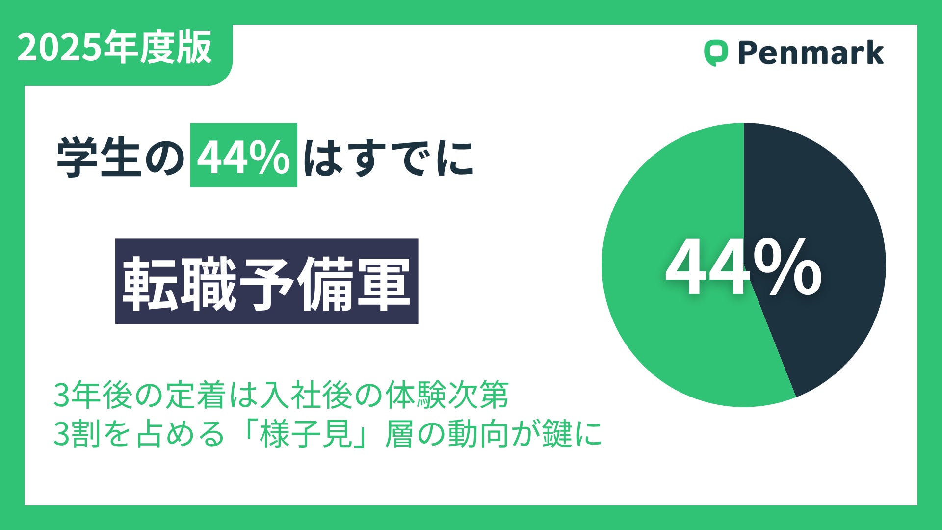 出典:Z世代学生の44%は「転職予備軍」、”とりあえず3年”の裏で高まるキャリアの流動性 〜3年後の定着は入社後の体験次第、3割を占める「様子見」層の動向が鍵に〜