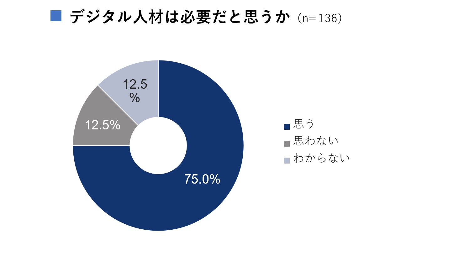 まずは、デジタル人材の必要性を問う調査の結果です。中小企業の生産性工場や持続可能な成長に向けて必要なDXには、デジタルに対応する人材が不可欠です。実際にデジタル人材を必要だと「思う」と回答した企業は75.0%でした。経済産業省から最初のDXレポートが発行されてから今年で7年となり、最近はAI技術の進展や労働集約型の事業でもデジタル化が進んでいます。その結果、デジタル人材のニーズがより一層増していると推察できます。一方で、「思わない」「わからない」と答えた人も2割ほどおり、デジタル人材の活用方法や費用対効果への不安、現状の取り組みを変革することへの抵抗感を持っている人も存在していると推察されます。