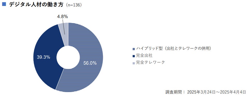 最後にデジタル人材を採用した際に可能になる働き方についての調査です。最多は「ハイブリッド型(出社とテレワークの併用)」の56.0%、続いて「完全出社」(39.3%)、「完全テレワーク」(4.8%)という結果となりました。全体傾向としては、出社とテレワークを組み合わせた就労形態をイメージする企業が多いことが分かります。