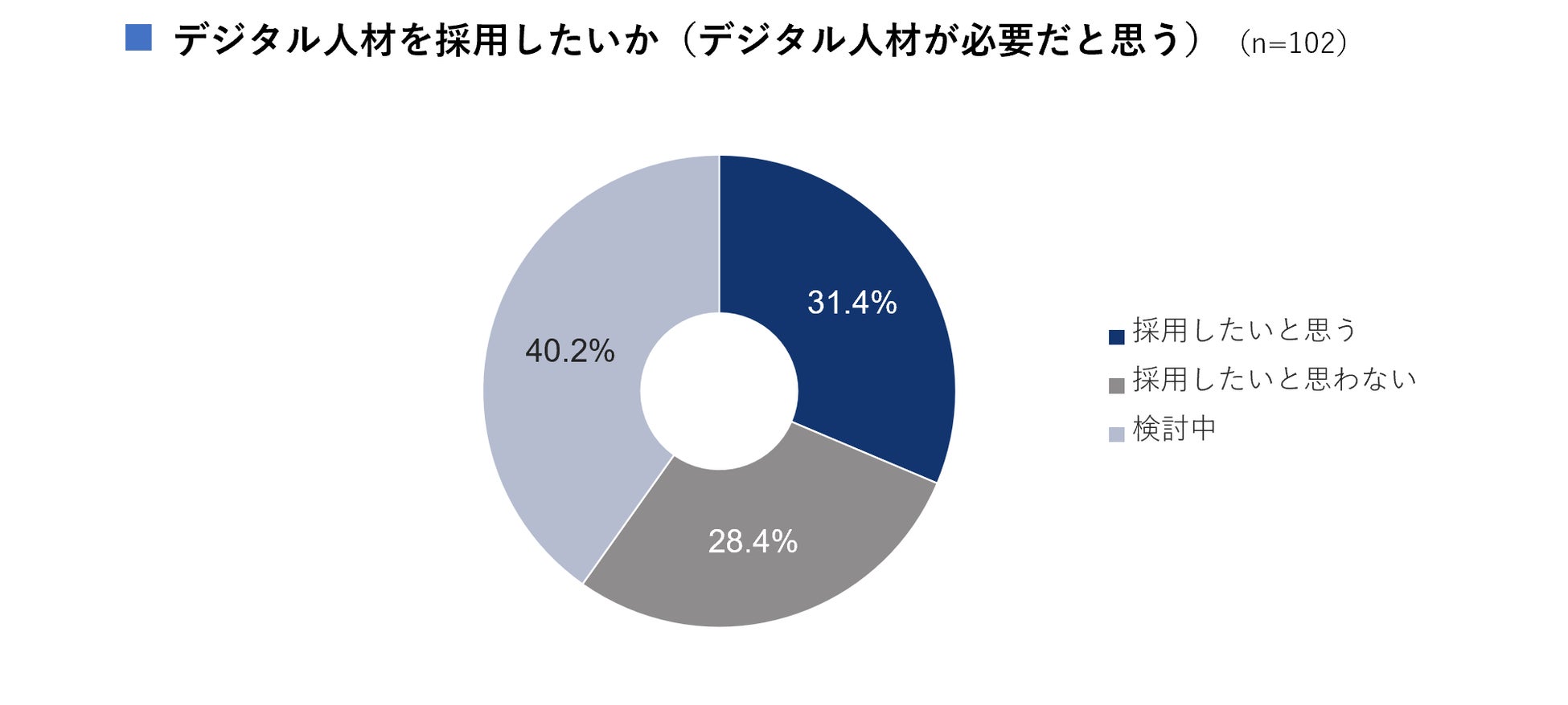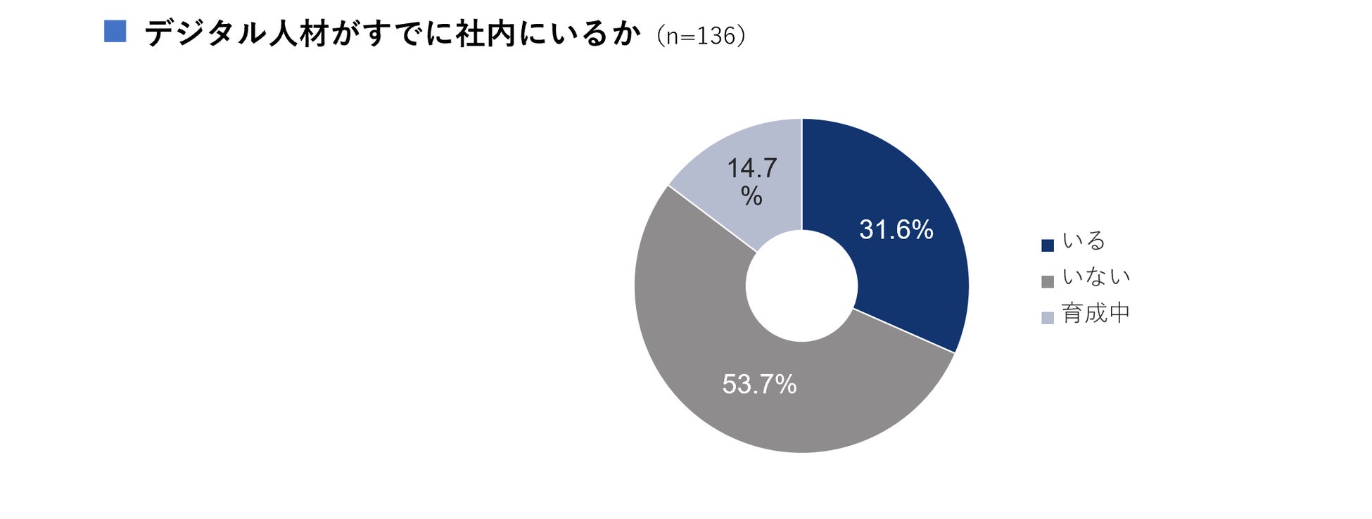 次に実際にデジタル人材が社内にいるかどうかの調査結果です。「いる」と回答した企業が31.6%、「いない」は53.7%となり、回答企業の過半数がデジタル人材を確保できていない実態が明らかとなりました。デジタル人材を社内で確保するメリットとして、経営環境の変化への対応可能性・自社業務の知識を持ったうえでの新技術活用・外部委託と比較したときのコスト削減等等が挙げられます。厳しい採用活動に直面する企業の打開策として、デジタル人材の社内育成を検討することが求められるでしょう。