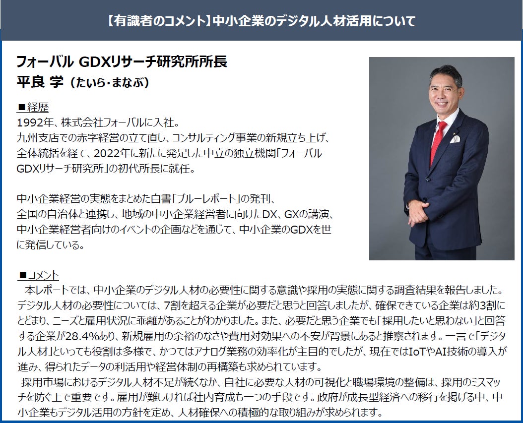 Green(グリーン)とDigital(デジタル)を活用した中小企業の変革を目指すフォーバル GDXリサーチ研究所(本社:東京都渋谷区、所長:平良学)は、中小企業とデジタル人材の実態について調査をした「研究レポート」を6月17日(火)に発行しました。