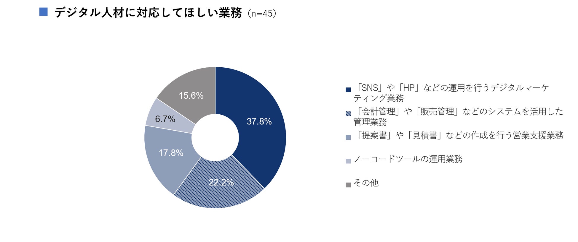 デジタル人材に対応してほしい業務についての調査結果です。デジタル人材に対応してほしい業務として、「『SNS』や『HP』などの運用を行うデジタルマーケティング業務」が37.8%で最多となり「 『会計管理』や『販売管理』などのシステムを活用した管理業務」、「『提案書』や『見積書』などの作成を行う営業支援業務」が続きました。これらの結果からは、現状の事業をデジタル技術で補完する、業務効率化や生産性向上の取り組みへの期待が大きいことが伺えます。特にデジタルマーケティングについては内製化の傾向が高まっていると推察できます。