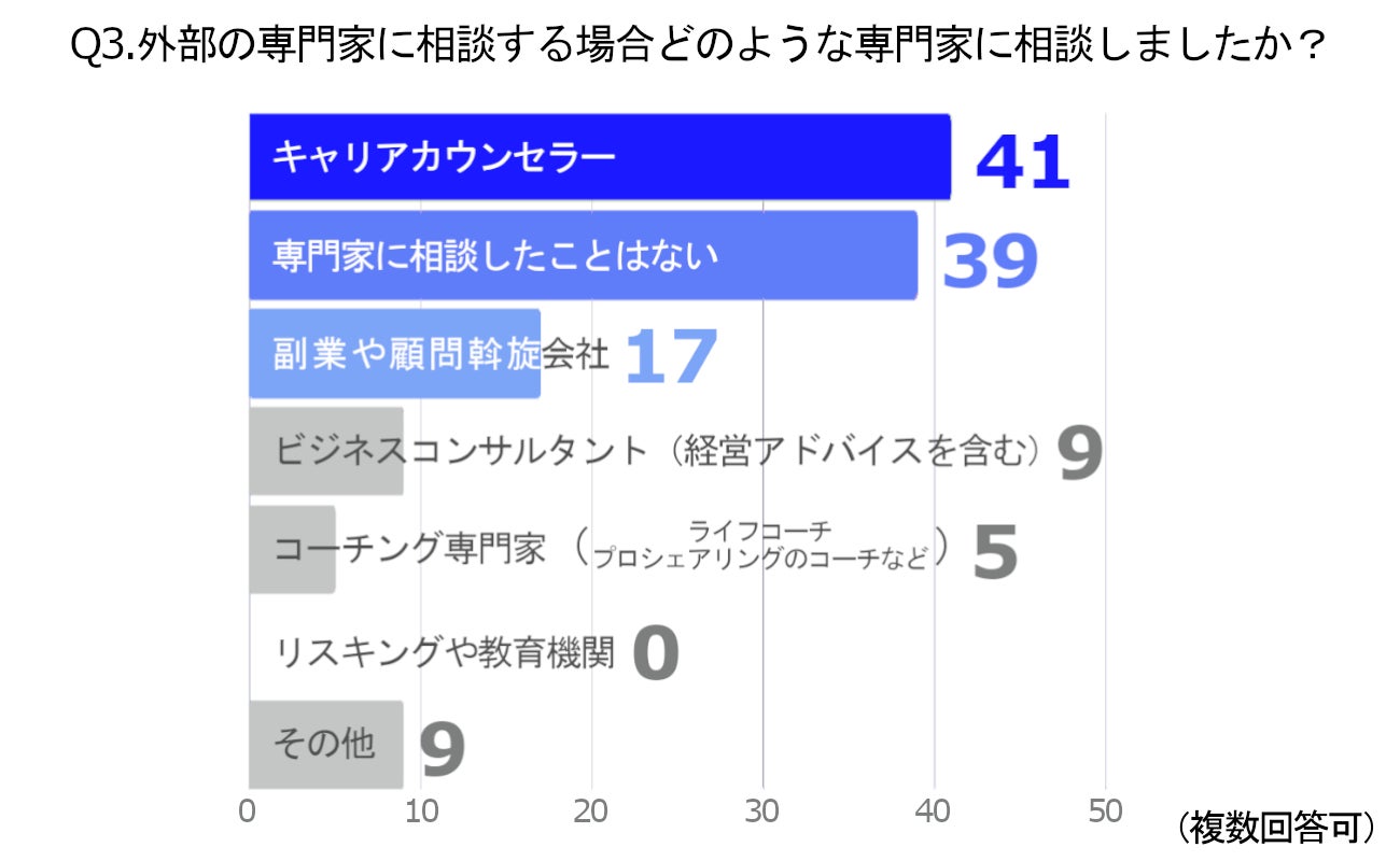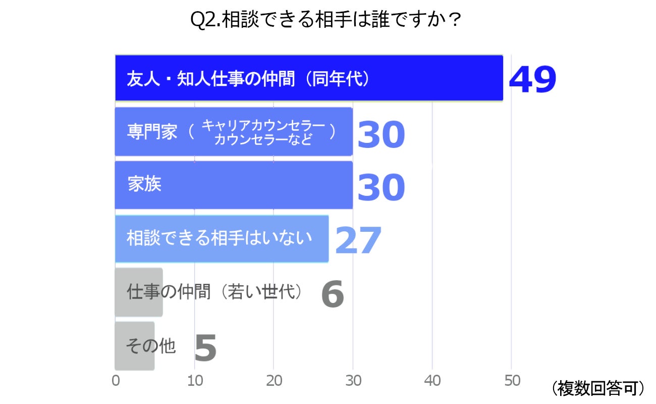 相談相手として最も多かったのは「友人・知人仕事の仲間(同年代)」で49%、次いで「専門家(キャリアカウンセラー、カウンセラーなど)」と「家族」がともに30%という結果になりました。また、「相談できる相手がいない」と回答した方が27%おり、Q1の結果とほぼ一致しています。自分の立場を共有しやすい同年代や、身近に存在する仲間が一番の相談相手になっている様子が見てとれます。