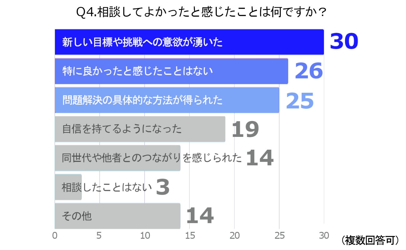 専門家への相談によって得られた効果としては、「新しい目標や挑戦への意欲が湧いた」が30%で最も多く、次いで「問題解決の具体的な方法が得られた」(25%)、「自信を持てるようになった」(19%)という結果になりました。一方で、「特に良かったと感じたことはない」という回答も26%ありました。