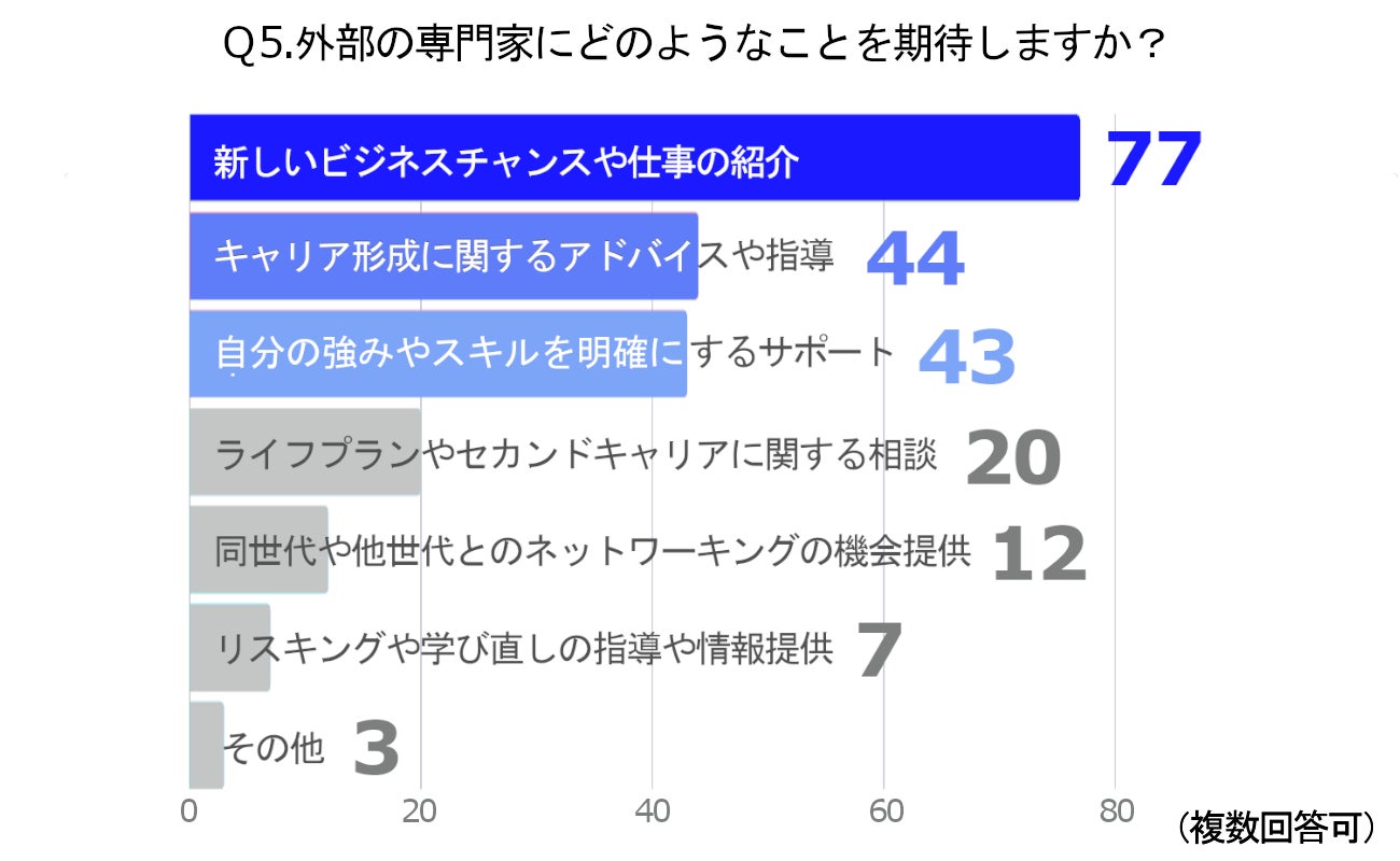 外部の専門家に期待することとしては、「新しいビジネスチャンスや仕事の紹介」が77%と圧倒的に高く、次いで「キャリア形成に関するアドバイスや指導」(44%)、「自分の強みやスキルを明確にするサポート」(43%)という結果になりました。また、「ライフプランやセカンドキャリアに関する相談」も20%の回答者が期待しています。