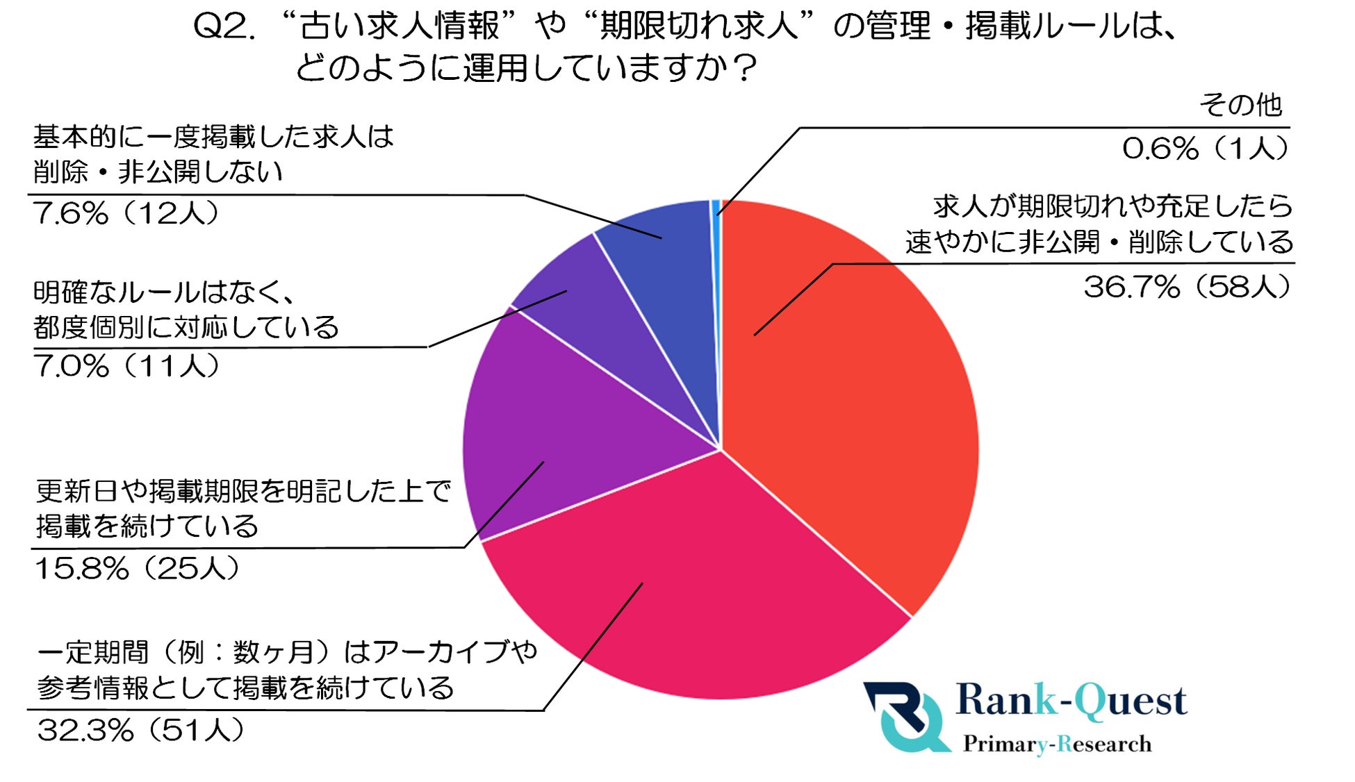 調査の結果、求人が「期限切れ」や「充足」した際には速やかに非公開・削除対応を行っている企業が36.7%(58人)と最も多く、情報の鮮度維持を重視する姿勢がうかがえます。