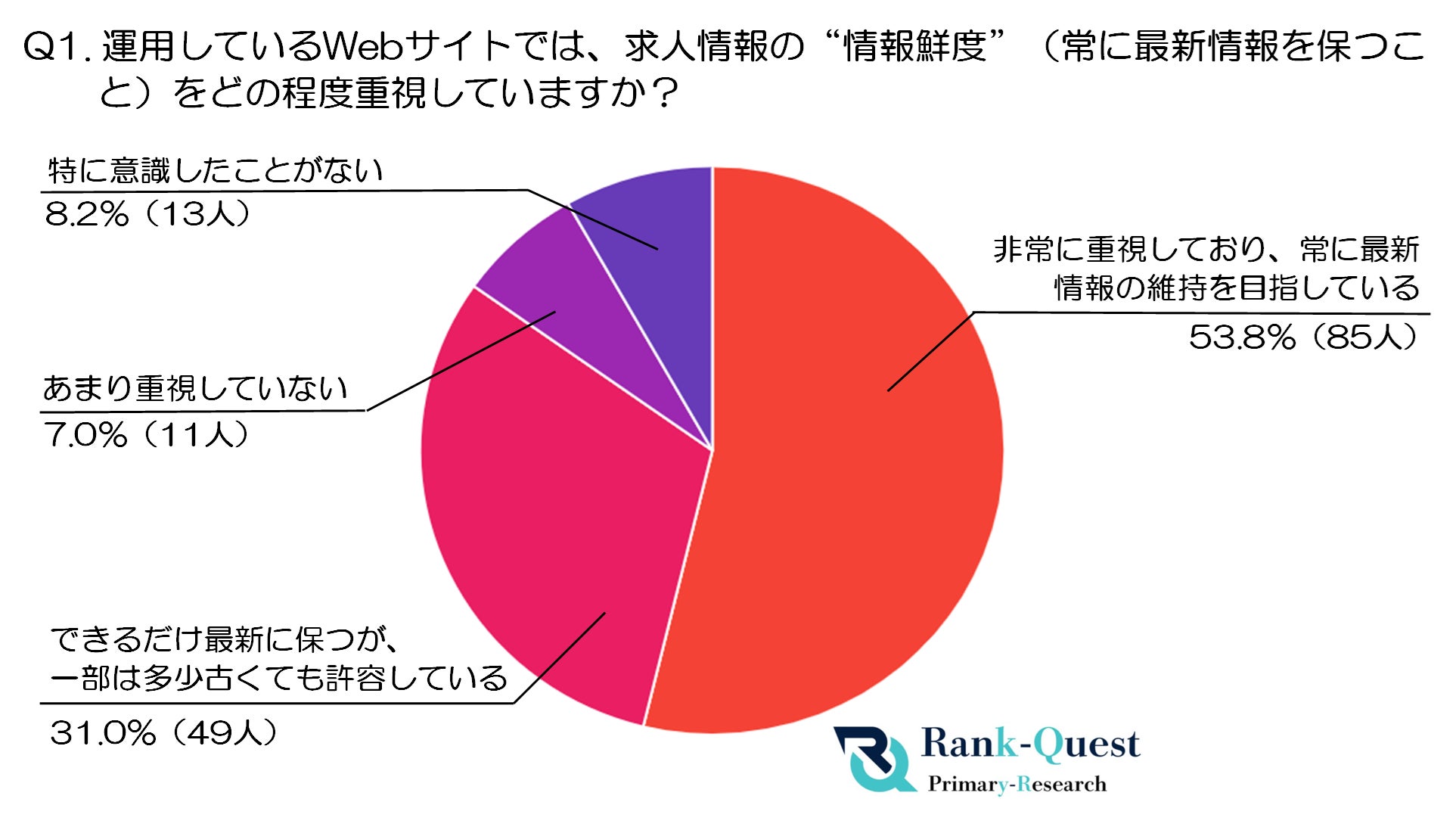 今回の調査結果から、求人情報の「情報鮮度」(常に最新情報を保つこと)を非常に重視している企業が全体の53.8%(85人)に上ることが明らかになりました。