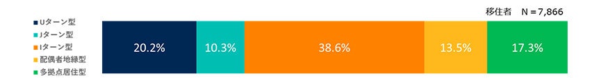 社会人になって以降、自身の意向で、都道府県をまたぐ地方圏への移住をしたことがある移住経験者(N=7,866)のうち、最も経験者の多い移住タイプ(※2)は、故郷とは別の地域に移住する「Iターン型」で38.6%であった。次いで、故郷の市町村に移住する「Uターン型」が20.2%、主たる生活拠点を持ちつつ他の地域にも拠点を設けて行き来する「多拠点居住型」が3番目に多く17.3%となった。