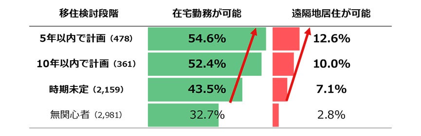 移住意向者(※4)のうち、現在働いている企業において、テレワーク等により「在宅勤務」や「遠隔地居住」の働き方が可能な状況にある人ほど、近い将来の計画として移住を具体的に検討している。