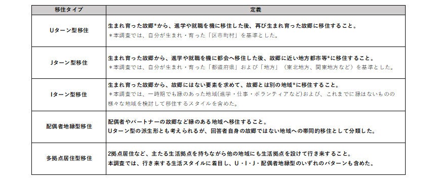 ・「移住」とは、自らが何らかの意思を持って、主たる生活拠点を別の地域に移すことと定義し、会社都合の転勤およびバカンスなどの行楽的滞在は除くこととした。一方で、2拠点居住やノマドワーカーなどについては、「多拠点居住」として統合し調査・分析の対象とした。