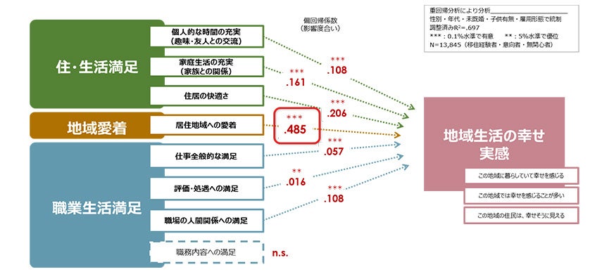 また本調査では、その地域に住んでいることに幸せを感じる度合い(地域生活の幸せ実感)には、住居の快適さや、家族・友人、職場の人間関係といった人的なつながりと共に、「その地域への愛着(地域愛着)」がより影響することが分かった(図表11)。従来さまざまな研究から、私生活と職業生活の充実は互いに影響し合い、人生全体の幸福感を高めることが知られている。今回の調査では、それら私生活(住・生活満足)と職業生活(職業生活満足)に加え、愛着が持てる地域に住むこと(地域愛着)が幸せな生活を送るためのひとつの要因であることが見えてきた。「愛着を抱ける地域に暮らし、働くこと」を自ら選んで決めることによって、働く一人ひとりの人生がより豊かなものになれば、働く上でのパフォーマンスも期待できるだろう。こうした観点からも、従業員の移住や地方との交流のための支援は、企業にとって重要なものと考える。