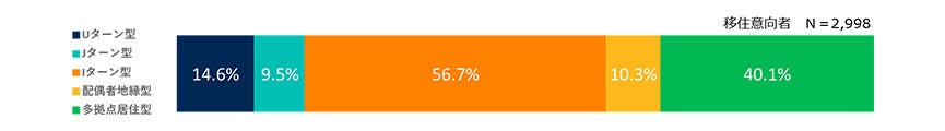 今後の移住を検討中である移住意向者(N=2,998)のうち、最も多く検討されている移住タイプは、故郷とは別の地域に移住する「Iターン型」で56.7%。次いで、主たる生活拠点を持ちつつ他の地域にも拠点を設けて行き来する「多拠点居住型」が40.1%となった。