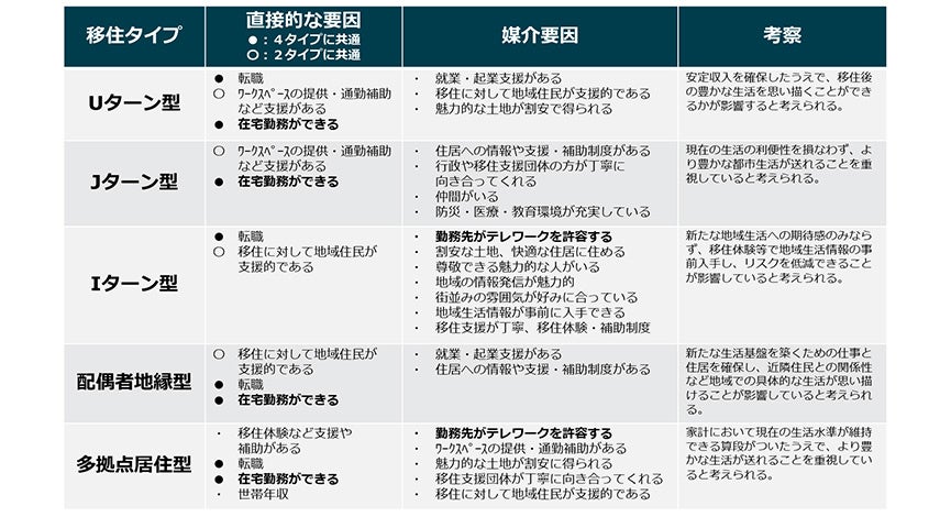 特に、仕事面に関しては、5つの移住タイプすべてにおいて、直接的な要因・媒介要因(※5)のどちらかに「在宅勤務ができる」「勤務先がテレワークを許容する」が含まれる結果となった。働き方の選択肢が増える中で、子育てや介護などさまざまな個人の事情や、働き方への価値観の変化により、働く場所に対する個人の要望も多様化している。企業として、こうした従業員の働く場所の要望に対応できることは、優秀な人材の獲得・リテンションにもつながるだろう。移住に際する意思決定に影響する要因のうち、「在宅勤務」や「テレワーク」を可能にする環境整備は、企業が優先的に検討すべき施策となっていることがうかがえる。