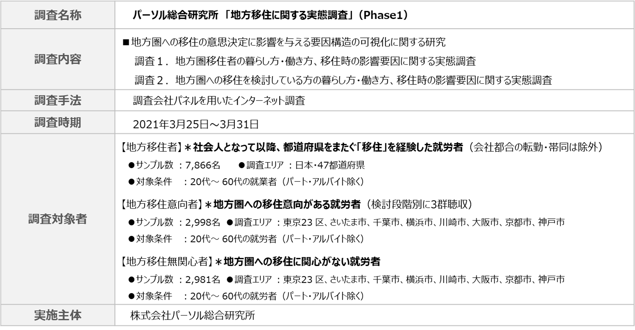 株式会社パーソル総合研究所(本社:東京都港区、代表取締役社長:渋谷和久)は、有職者の地方移住に関する調査結果を発表いたします。本調査は、コロナ禍によるテレワーク普及などを背景に地方圏への移住(※1)の関心が高まる中、地方移住の経験者および意向者の実態や、移住に対する意思決定の要因について定量的なデータ・知見を提供することにより、経営・人事、自治体、働く個人に資することを目的に実施しました。