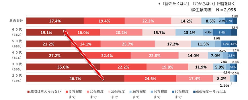移住意向者に、移住時の減収について許容できる減収幅を聞いたところ、20代では46.7%が「減収は考えられない」と回答した。また、年代を経るごとに減収を許容する傾向も確認された。