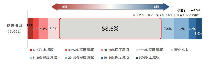 移住経験者のうち、移住に伴って転職をしなかった人は53.4%(図表2)。移住に伴う年収変化は、58.6%が「変化なし」と回答した(「わからない・答えたくない」を除いて集計)(図表3)。従来、移住には転職が伴うと考えられ、移住促進に際し、地方圏に適した仕事がない点が課題視される傾向にあったが、今回の調査では《転職なき移住》が半数を占めることが明らかとなった。