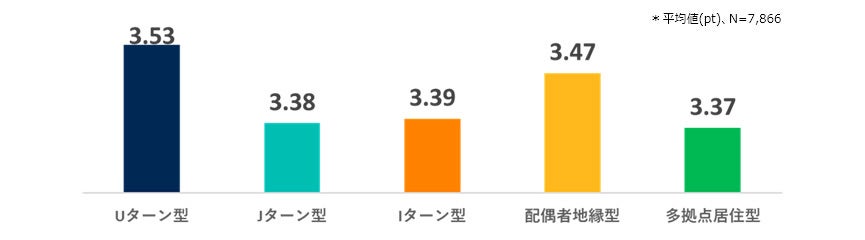 移住経験者に、移住後の地域における暮らしについて、「その地域に住むこと自体に幸せを感じているか」を5段階(※3)で評価してもらったところ、「Uターン型」や「配偶者地縁型」は評価が高く、「Jターン型」「Iターン型」「多拠点居住型」は評価が低い傾向が見られた。Uターン型や配偶者地縁型は、その他の移住タイプに比べ、移住後の地域における情報や人脈を持っている場合が多い。そのため、リアリティショックや孤立などのリスクが低いことが影響していると考えられる。