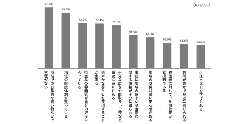 移住意向者に対し、移住検討時に影響する項目を聞くと、1位は「地域での日常的な買い物などで不便がない」、2位は「地域の医療体制が整っている」となった。また、3位・4位には「街並みの雰囲気」や「穏やかな暮らしの実現」といった曖昧で主観的な項目が挙がった。移住に際しては、生活上必要な具体的条件(生活基盤の担保)だけでなく、移住候補地に対してポジティブな印象や期待感を抱けるといった情緒的な側面も重視されているようだ。