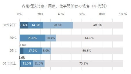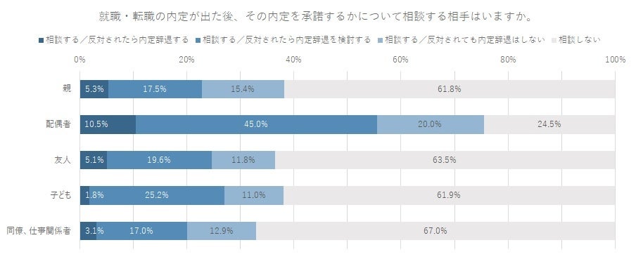 相談対象が「親」「配偶者」「友人」「子ども」「同僚、仕事関係者」のうち、「相談する」割合が最も高かったのは「配偶者」の75.5%だった。配偶者の場合、生活費をはじめとした資金面での共有事項や、勤務地によっては転居の可能性もあり、多くの人が「相談する」ことを選ぶようだ。相談した結果、反対された場合「内定辞退を検討する」と回答した割合は、全体計で45.0%、「相談しない」の回答を除いて集計をすると59.6%と約6割となった。配偶者の意見が内定承諾の判断に大きく関わっているようだ。