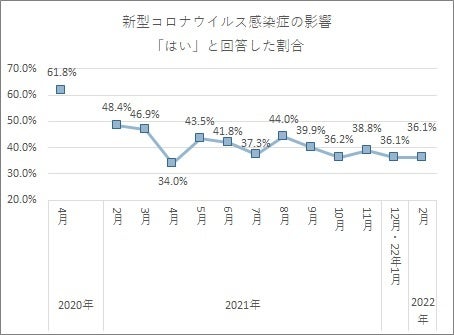 全体で36.1%が「はい」と回答し、前回調査(2022年2月発表)から変わらなかった。新型コロナウイルス感染症の影響を受けて仕事探しをしていた割合は4割を下回った。