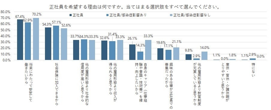 一方、「感染症影響なし」の人は「感染症影響あり」の人よりも「自身のキャリア(仕事経験や意識・技術等)を維持・向上したいから」が19.0pt、「他の雇用形態より教育制度が充実していると思うから」が11.1pt、「将来にわたって安定して働きたいから」が7.3pt高かった。長く腰を据えられる職場を探している人が多いようだ。
