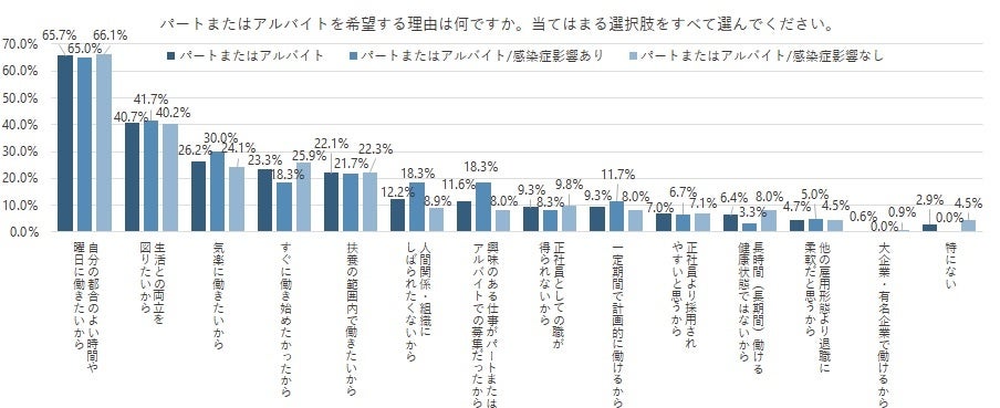 「自分の都合の良い時間や曜日に働きたいから」が65.7%で最多。次いで「生活との両立を図りたいから」40.7%、「気楽に働きたいから」26.2%