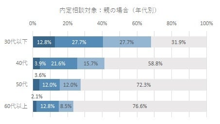 相談相手が親の場合、年代別に相談の有無をみると、「30代以下」ではおよそ7割が「相談する」と回答した。反対されたとき「辞退する」と回答した割合は12.8%、「辞退を検討する」は27.7%で、親の判断が大きくかかわっていることが伺える。