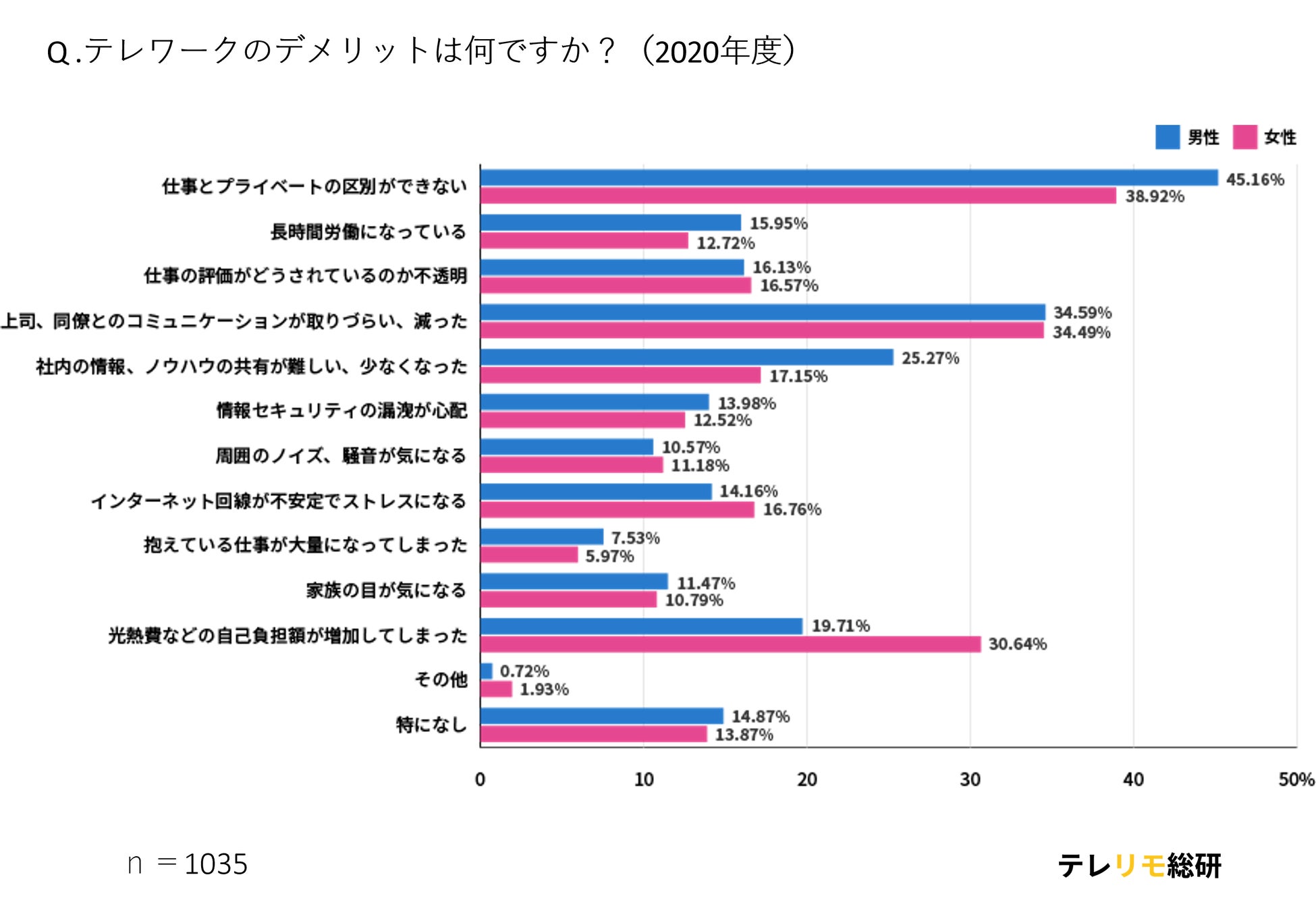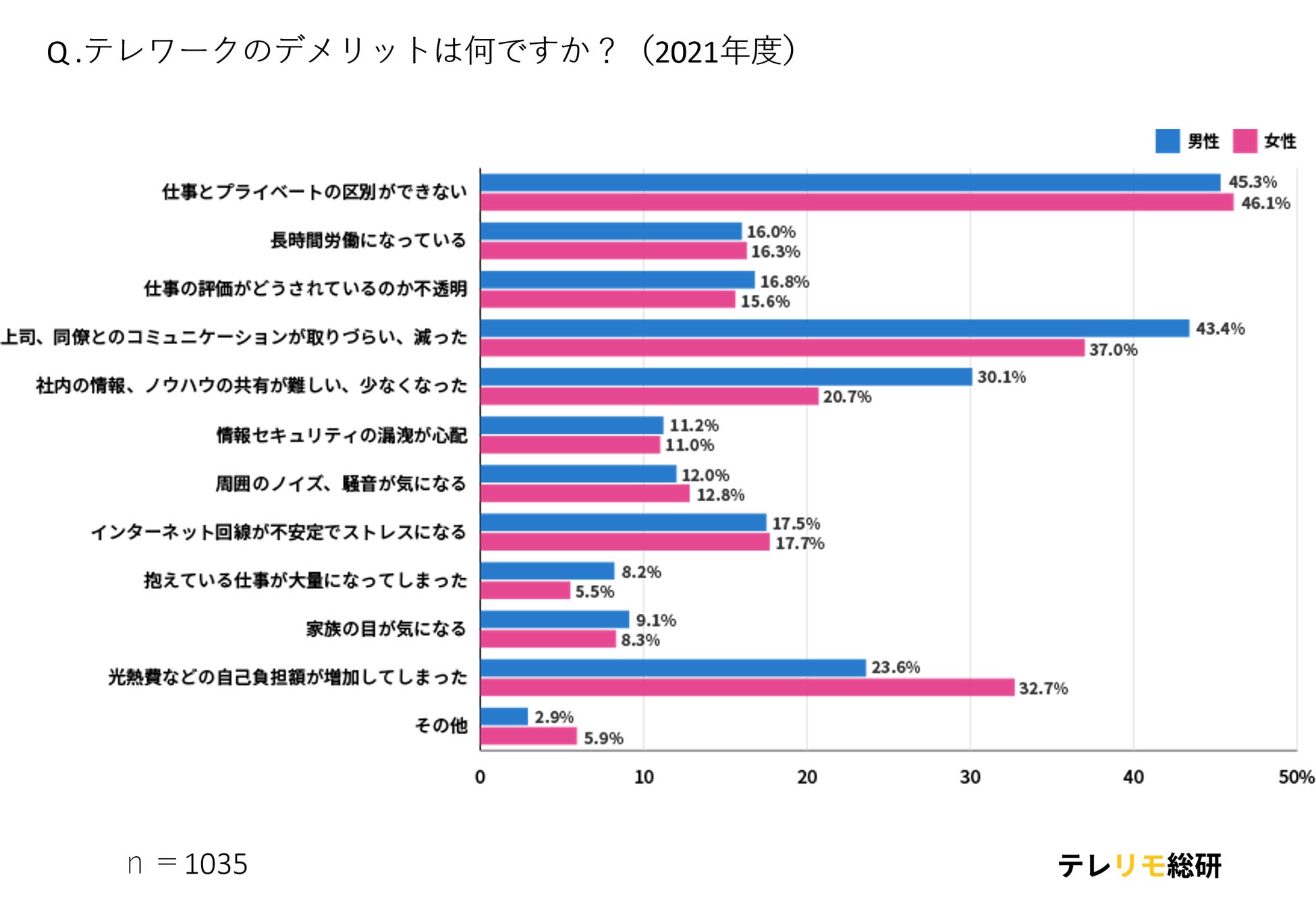 続いて、テレワークの『デメリット』に関する調査結果がこちらです。