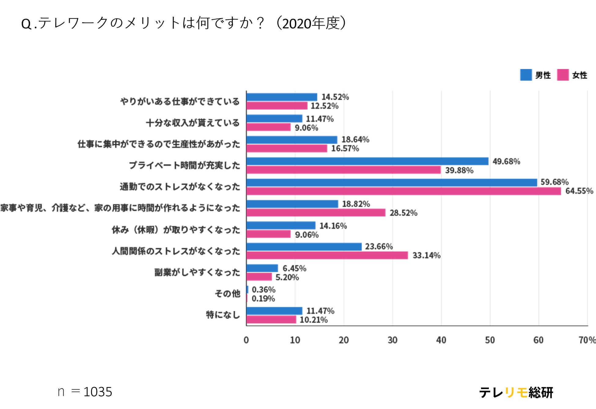 次いで、「プライベート時間が充実した」、「人間関係のストレスがなくなった」と続き、こちらも2020年と同様の結果となりました。時間の有効活用や精神的なストレス軽減はテレワーク最大のメリットと言えそうです。なかでも、「プライベート時間が充実した」と回答した女性は前回から約7%増加しています。