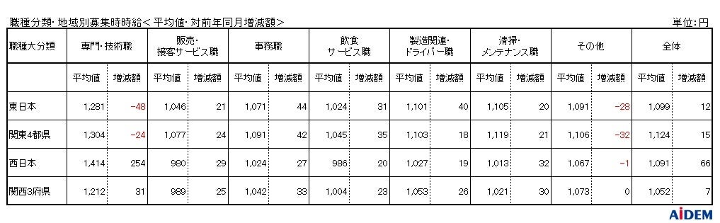 職種大分類別の平均時給は、「専門・技術職」1,304円(前年同月比24円減)、「清掃・メンテナンス職」1,119円(同21円増)、「製造関連・ドライバー職」1,103円(同18円増)、「事務職」1,091円(同42円増)、「販売・接客サービス職」1,077円(同24円増)、「飲食サービス職」1,045円(同35円増)の順で、前年同月比でプラスが5職種、マイナスが1職種となった。都県別の平均時給は、東京都1,164円(前年同月比19円増)、神奈川県1,125円(同5円増)、千葉県1,075円(同23円増)、埼玉県1,072円(同11円増)の順となり、前年同月比で全ての都県がプラスとなった。