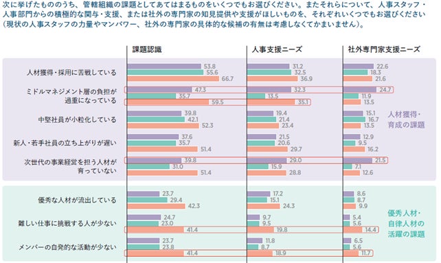 現場の課題認識は、人材獲得、ミドルマネジメントの過重負担、中堅・若手・次世代リーダー育成