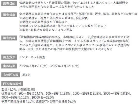 企業における経営・人事課題の解決および、事業・戦略の推進を支援する株式会社リクルートマネジメントソリューションズ(本社:東京都品川区 代表取締役社長:山﨑 淳 以下、当社)は、2022年3月に事業統括責任者または直接部門・部署(営業、販売、製造、開発など)の責任者361名に対し、「人・組織課題解決の支援ニーズに関する調査」を実施し、調査結果を公表しました。