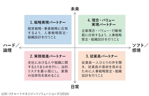 昨今の社会環境の変化を受けて、企業における人と組織の課題とその解決についての重要性が増しています。それらは人事部門だけが担うのではなく、ラインの管理職、従業員、社外専門家などが協同で担うものであることは1980年代当時から議論されてきています。種々の議論を整理すると、企業内の人事機能は下の図のように描くことができます。4つの機能のいずれも、人事部門や社外専門家などの人事専門家が、事業現場の戦略や人をよく理解し、連携することの重要性を示唆しています。そして、昨今、人事部門や専門家の側が現場に寄り添うことの重要性はより強まっていると言えます。