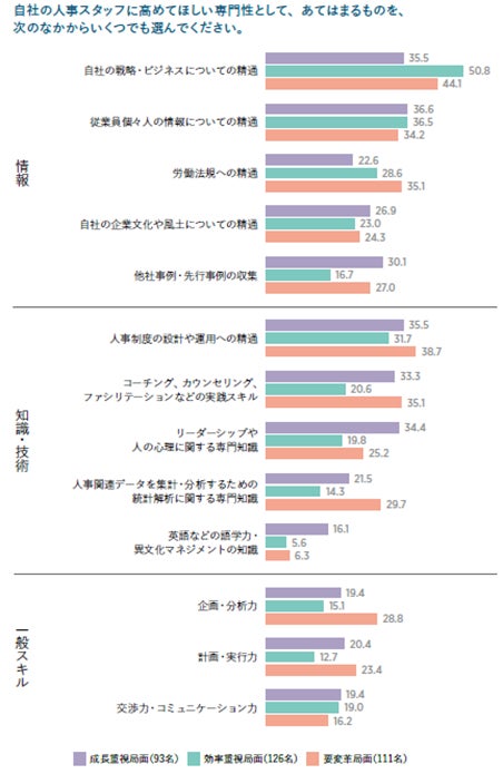 知識・技術面では、「人事制度の設計や運用への精通」が共通の期待として挙げられる。「コーチング、カウンセリング、ファシリテーションなどの実践スキル」は、効率重視局面ではさほどでないが、成長重視局面、要変革局面では3分の1以上が選択している。他に、成長重視局面では「リーダーシップや人の心理に関する専門知識」「英語などの語学力・異文化マネジメントの知識」への期待、要変革局面では「人事関連データを集計・分析するための統計解析に関する専門知識」への期待に特徴がみられる。