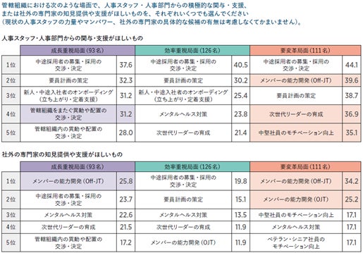 要変革局面では、人事支援ニーズが「メンバーの能力開発(Off-JT)」、「次世代リーダーの育成」、「中堅社員のモチベーション向上」で高く、横の異動というよりは、縦方向のマネジメントを強化する人材育成が社内人事に期待されている。社外の専門家に対しては「メンバーの能力開発(Off-JT)」(34.2%)だけでなく、「メンバーの能力開発(OJT)」(25.2%)でも高いのが特徴で、専門家の風を入れて、職場における人材育成を変革・強化したいという意図が推察される。