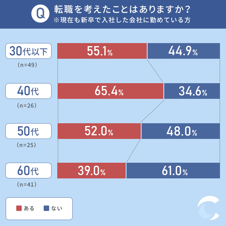 転職を考えたことはあるかという質問では、各世代で半数以上の方が「転職を考えたことがある」と回答しました。