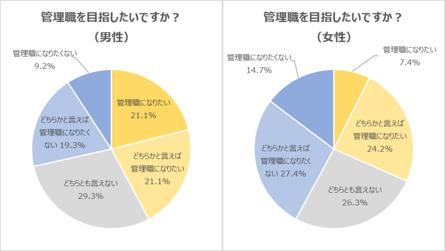 「管理職を目指したいですか?」という質問において、「管理職になりたい」「どちらかと言えば管理職になりたい」と回答した20代は37.8%でした。男女別では、「管理職になりたい」「どちらかと言えば管理職になりたい」と回答した割合が、男性は42.2%、女性は31.6%となっています。管理職を目指したいと回答した20代からは「裁量を持って働きたい」「社会や組織に貢献していくために、より責任のある立場で仕事をしたい」「キャリアアップを目指すことは、働く上でのモチベーションにもなる」などの声が寄せられました。一方、「まずは最初のステップとして、主任や係長を目指したい」「現時点では管理職は目指していないものの、役職を1つずつ上げていくなかで、ゆくゆくは挑戦してみたい」といった声も上がっており、1つずつステップを上がっていきたいという意向も伺えます。