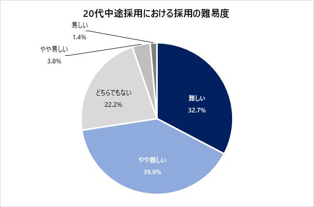 20代中途採用における採用の難易度について、「難しい」と回答した企業が32.7%に上りました。「やや難しい」39.9%を合わせると、7割以上の人事担当者が、20代中途採用は採用の難易度が高いと感じていることが分かります。「求めるスキルを持つ人材を採用するためには、給与水準を上げる必要がある」「新卒採用だけでなく、20代採用市場も競争が激しくなっている」など、採用市況が活況であることを指摘する声が寄せられました。また、「残業時間を削減するなど、20代から選ばれる職場環境を作っていく必要があると思う」「多様性や共感を重視する世代なので、個別の対話が重要だと感じる」といった声も上がっています。