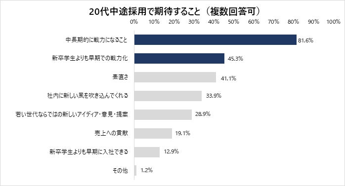 20代中途採用で、採用した人材に期待することは「中長期的な戦力になること」が81.6%で最多。次いで、「新卒学生よりも早期での戦力化」45.3%が続きました。育成し、長期的なスパンで活躍してくれることを前提としつつ、新卒学生よりも早期に戦力化して欲しいという企業の期待が伺えます。