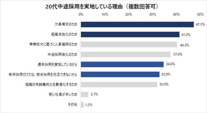 (1) 20代中途採用を実施する理由は「欠員補充のため」が47.3%で最多。「通年採用を実施しているから」も3割超