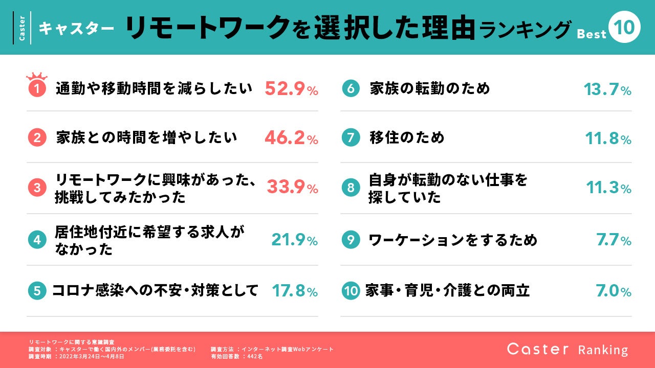 3位は「リモートワークに興味があった、挑戦したかった」、4位は「居住地付近に希望する求人がなかった」となっており、コロナ禍でリモートワークの認知が広がったことで、リモートワークにチャレンジしたり、地方であっても希望の仕事をする手段としてリモートワークを選択する人が増えてきていることが分かります。