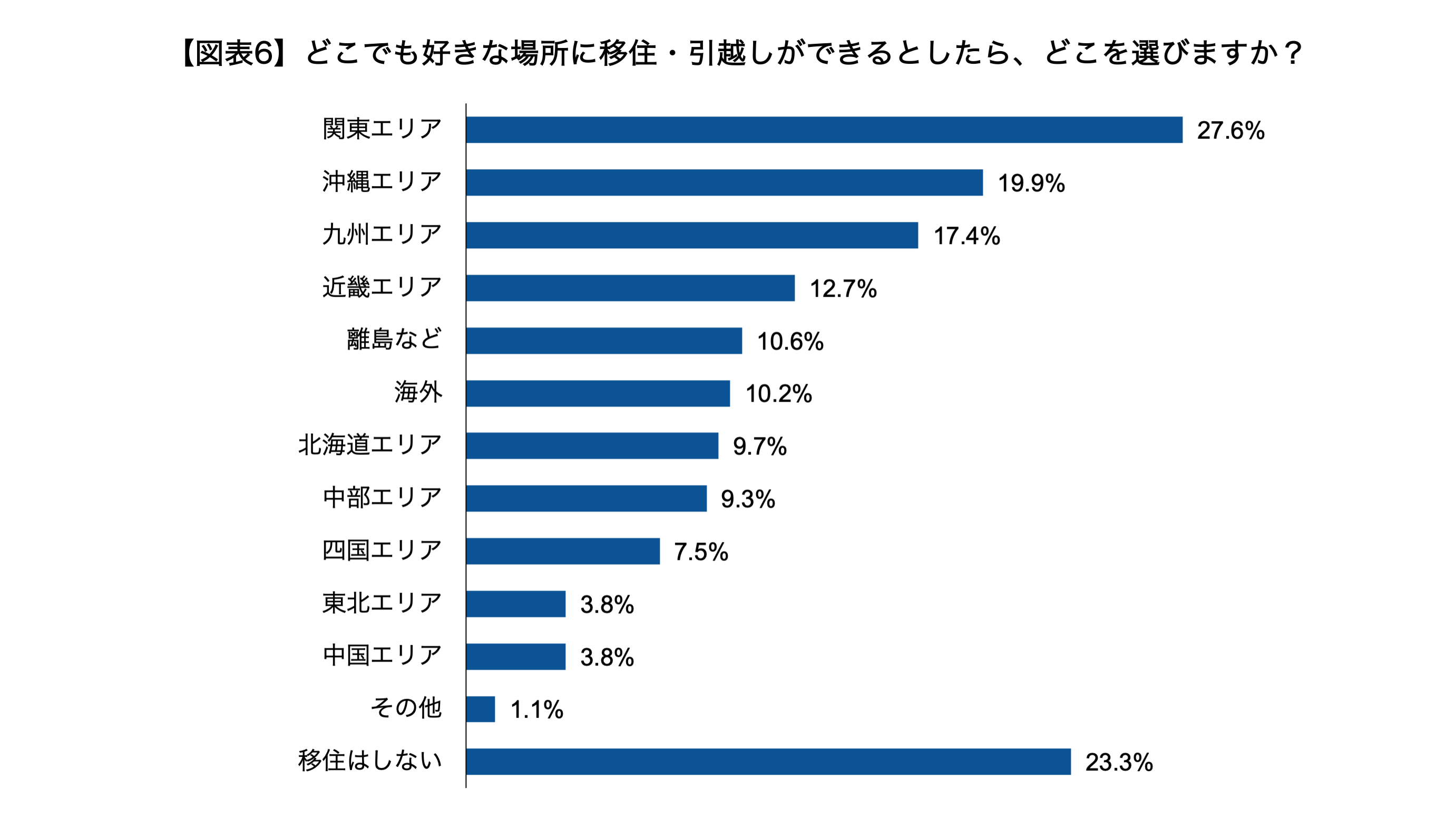 石倉:どこでも仕事ができるリモートワークは、「地方移住」の可能性とともに語られることも多いですが、本調査では異なる結果となりました。「どこでも好きな場所に移住・引越しができるとしたら、どこを選びますか?(※移住予算が十分あると仮定して考えてみてください)」という質問に対しては、「関東エリア」が27.6%と最も多い結果に(図表6)。社内にはUターンやIターンをして働いているメンバーもいますが、一概に「リモートワーク=地方移住ブームが来る」とは言えなさそうです。