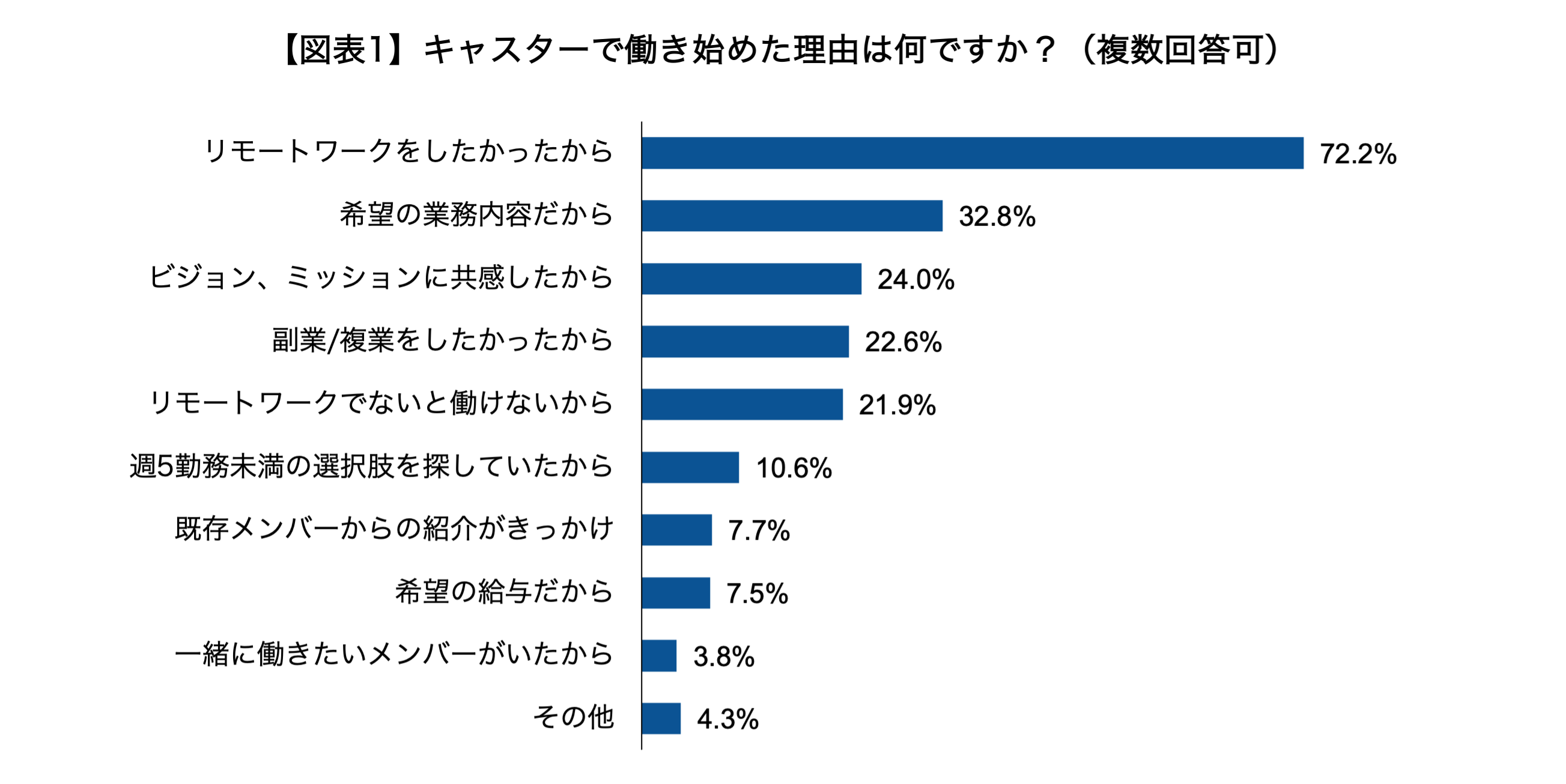石倉:コロナ禍でリモートワークは加速しましたが、出社が1日でもある「リモート」と、出社がゼロの「フルリモート」は似て非なるものです。キャスターでは、研修や全社総会などもすべてオンラインで実施し、メンバーがオフラインで集まる場は会社としては設けていません。メンバーからも、実際に入社してみて「“本当に”出社しないんだ」「メンバーに1度も会ったことがない」と驚かれるほどです。しかし、だからこそ、居住地に関わらず優秀な人材を採用することができ、現在47都道府県23ヶ国で1400人以上が働いています。入社理由において「リモートワークでないと働けない」と21.9%が回答(図表1)していることからも、出社が1日でも発生すれば働けなかった人がかなりの数存在するということです。リモートワークを選ぶ理由の詳細は、「パートナーが転勤族で、その度に仕事を変えざるを得ずキャリアアップが難しかった」「ハウスダストアレルギーで、エアコンがフル稼働するオフィスが辛い」「地方在住で、業務内容・賃金ともに希望する求人がなかった」「ペットと一緒にいたい」「将来、地元に戻る選択肢もほしい」など多岐にわたります。