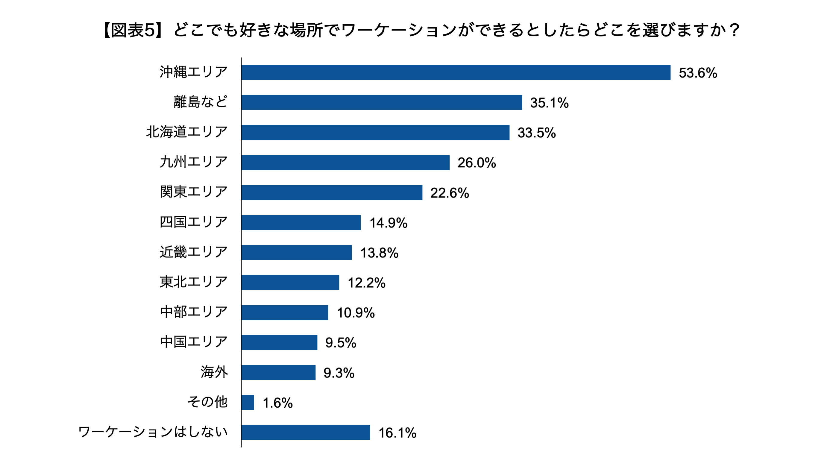 また、「好きな場所でワーケーションができるとしたらどこを選びますか?(※予算が十分あると仮定)」という質問に対する、16.1%が「ワーケーションはしない」という回答(図表5)から、旅行は好きだが、旅行先でまで仕事をしたくないという人も少なくないのではないかと思います。「リモートワーク=リゾートで悠々自適に仕事をする」などのイメージと現実は違いそうです。