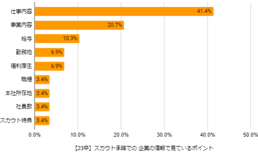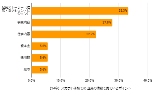 就職活動の早期化が進んでいる中、企業との初回接触となるスカウトに関して「スカウトを受け取る際に企業を見ているポイントは何か」を24卒学生にヒアリングしたところ、「ミッション」、「仕事内容」、「事業内容」と回答した学生が全体の約83.3%となった。「給与」、「勤務地」、「福利厚生」などの割合が多い23卒と比較すると早期で就活を開始している24卒学生はより企業の理念共感や成長性、取り組んでいるビジネスモデルに関心を抱いていることがわかる。